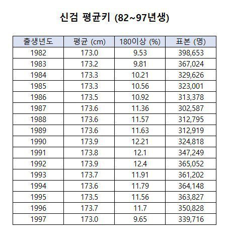 실제로 1982년생부터 1997년생까지 16년간 진행된 신체검사에서 평균 키가 174cm를 넘긴 적이 한 번도 없었기 때문.