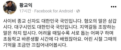 [스크랩] [기타]???: 신천지도 대한민국 국민입니다 작성자1년동안 억울활중 3번|작성시간20.02.23|조회수5,752 목록 댓글 44 글자크기 작게가 글자크기 크게가 출처 : https://www.dmitory.com/issue/112339999 다음검색 스크랩 원문 : *여성시대* 차분한 20대들의 알흠다운 공간 현재 게시글 추가 기능 열기 북마크 공유하기 신고 센터로 신고 댓글 댓글 44 댓글쓰기 답글쓰기 댓글 리스트 작성자머리아파힝 | 작성시간 20.02.23 삐빅 신천지입니다 작성자윌리엄=120 | 작성시간 20.02.23 ㄲㅈ 작성자Asee | 작성시간 20.02.23 조까 작성자에비애비 | 작성시간 20.02.23 대구랑 신천지를 같은 선상에 두네;? 작성자퇴퉤사 | 작성시간 20.02.24 그냥 입 쳐닫고 살면 안됨? 댓글 전체보기