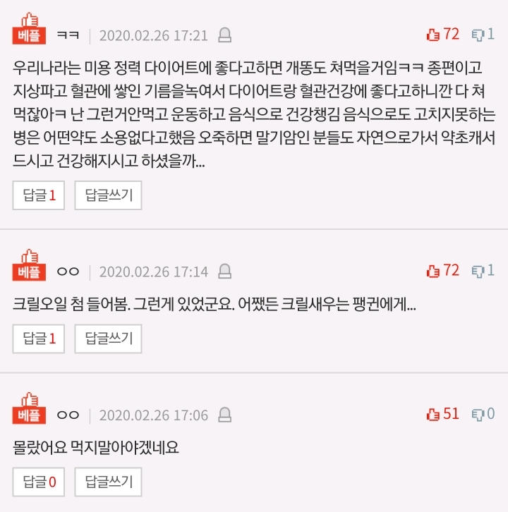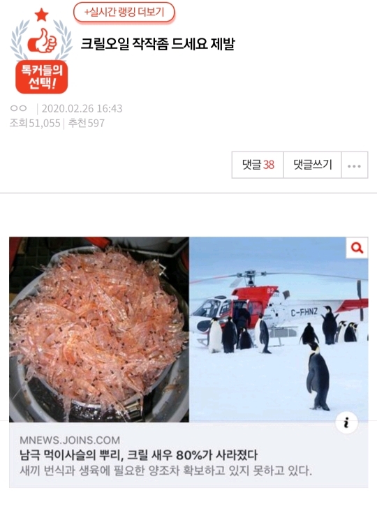 크릴오일에 많이 들어있다던 인지질은 우리몸에서 합성 가능하고 계란노른자에 더 많이들어있음. 오메가 3는 식물유에 더 많이 들어있음. 그런데도 왜 비싸고 사람에따라 효과도 천차만별이고 부작용도 센 크릴오일만 드십니까. 홈쇼핑 광고말고 다른건 모르는 까막눈인거 인증하는 꼴이잖아요.