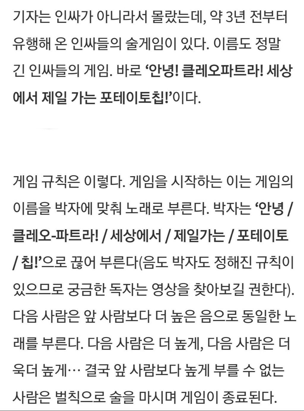[기타]술 게임 안녕 클레오파트라 명칭의 유래 작성자QUESTION|작성시간20.03.11|조회수6,643 목록 댓글 10 글자크기 작게가 글자크기 크게가 동영상안녕 클레오파트라~세상에서 제일가는 포테이토칩~여기를 눌러 링크를 확인하세요www.youtube.com 출처 펨코 다음검색 현재 게시글 추가 기능 열기 북마크 공유하기 신고 센터로 신고 댓글 댓글 10 댓글쓰기 답글쓰기 댓글 리스트 작성자BTBTBTS | 작성시간 20.03.11 헉 미친ㅋㅋㅋㅋㅋㅋ난 그냥 말도 안되는말 연결해둔줄 작성자로렐라이 길모어 | 작성시간 20.03.11 술집에서 저거하면 존나 시끄러 작성자FL♡WER | 작성시간 20.03.11 와 신기해 작성자아베아베아베마리아 | 작성시간 20.03.11 와 ㅋㅋㅋㅋ 대박 복면가왕이 유래인줄 몰랐음 ㅋㅋ 나름 신식 게임이였군ㅋㅋ 작성자달걀머니나 | 작성시간 20.03.11 저거 새내기때도 하던거라 원래있는 술겜인줄,, 댓글 전체보기