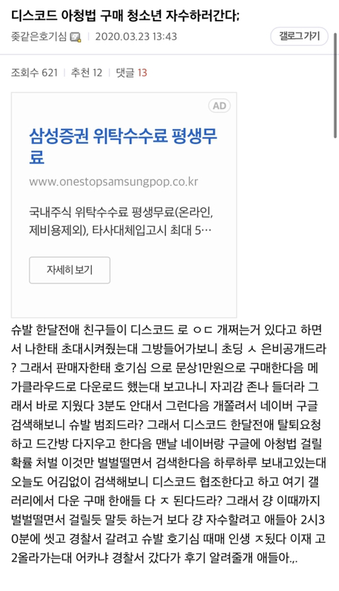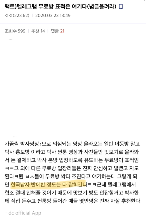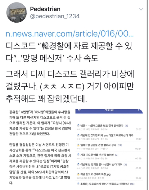 [기타](음란물 공유 용도로 쓰인) 디스코드 수사 협조 기사에 난리난 그남들 (현재 폐쇄된 갤러리) 작성자呷哺呷哺|작성시간20.03.25|조회수3,491 목록 댓글 14 글자크기 작게가 글자크기 크게가 위에 있는 트윗을 보고 저 갤러리에 들어가 봤음+이래도 일부 한남이라고?한강 5부제 추천 다음검색 현재 게시글 추가 기능 열기 북마크 공유하기 신고 센터로 신고 댓글 댓글 14 댓글쓰기 답글쓰기 댓글 리스트 작성자힘이 들 땐 수호를 봐 | 작성시간 20.03.25 한강 오부제도 한강물이 아까워서 짱나니까 걍 일렬로 세우고 총살 ㄱ 삭제된 댓글입니다. 답댓글 작성자꾸임 | 작성시간 20.03.25 ㄴㄴ 일종의 채팅방, 메신저라고 보면됨 제2의텔레그램 답댓글 작성자욜룔룔렬룔 | 작성시간 20.03.25 게임할때 많이 쓰는 메신저! 작성자아델리친스트랩엠페러젠투 | 작성시간 20.03.25 유충도 있네 ㅅㅂ 댓글 전체보기