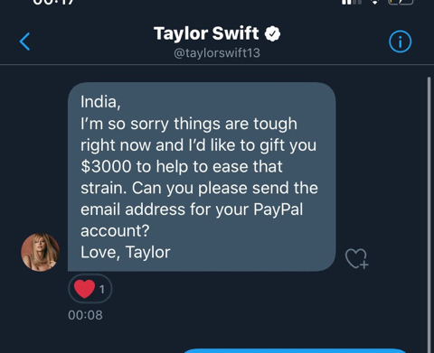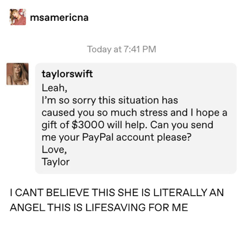 팬의 어려운 경제사정을 알고 도움을 주고싶으니 페이팔계정을 알려달라는 테일러
