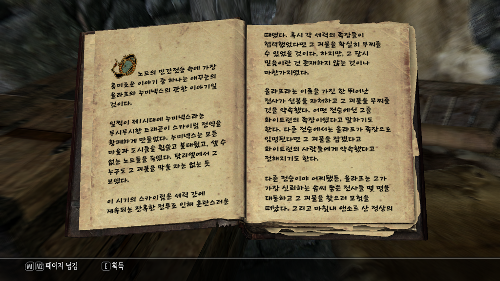 [일찍이 제1세대에 누미넥스라는 무시무시한 드래곤이 스카이림 전역을 황폐하게 만들었다. 올라프라는 이름을 가진 한 뛰어난 전사가 선봉을 자처하고 그 괴물을 무찌를 것을 약속했다.]