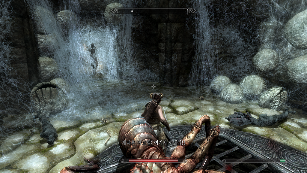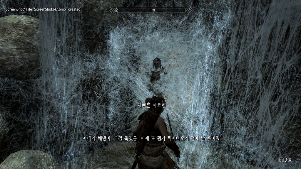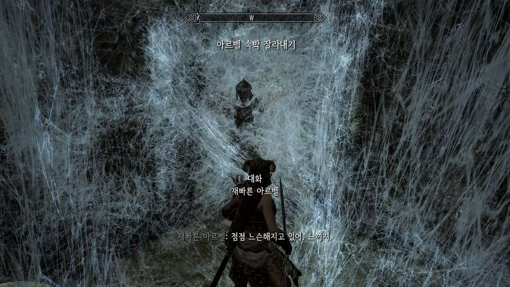 그리고 거미줄에는 '재빠른 아르벨'이라는 이름의 다크엘프가 꽁꽁 묶여 있었지.