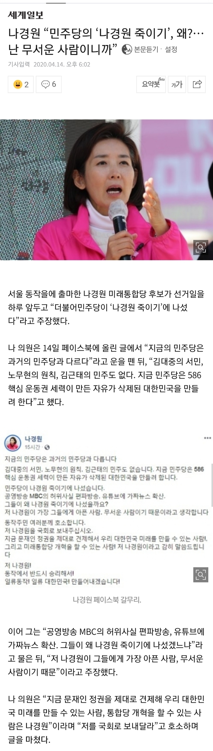 [기사]나경원 “민주당의 ‘나경원 죽이기’, 왜?… 난 무서운 사람이니까” 작성자메비우스그린|작성시간20.04.14|조회수1,155 목록 댓글 28 글자크기 작게가 글자크기 크게가 https://n.news.naver.com/article/022/0003456457 다음검색 현재 게시글 추가 기능 열기 북마크 공유하기 신고 센터로 신고 댓글 댓글 28 댓글쓰기 답글쓰기 댓글 리스트 작성자쉬쉬러 | 작성시간 20.04.14 ㅋㅋㅋㅋㅋㅋㅋ 작성자ZYRA | 작성시간 20.04.14 와 너무 무섭다 작성자벤츠타는레즈 | 작성시간 20.04.14 뭐래? 아닥 이미지 확대 작성자별을쏘다☆★ | 작성시간 20.04.14 엥? 자의시과잉이네 작성자지니22♥ | 작성시간 20.04.14 아...뉘예뉘예 댓글 전체보기