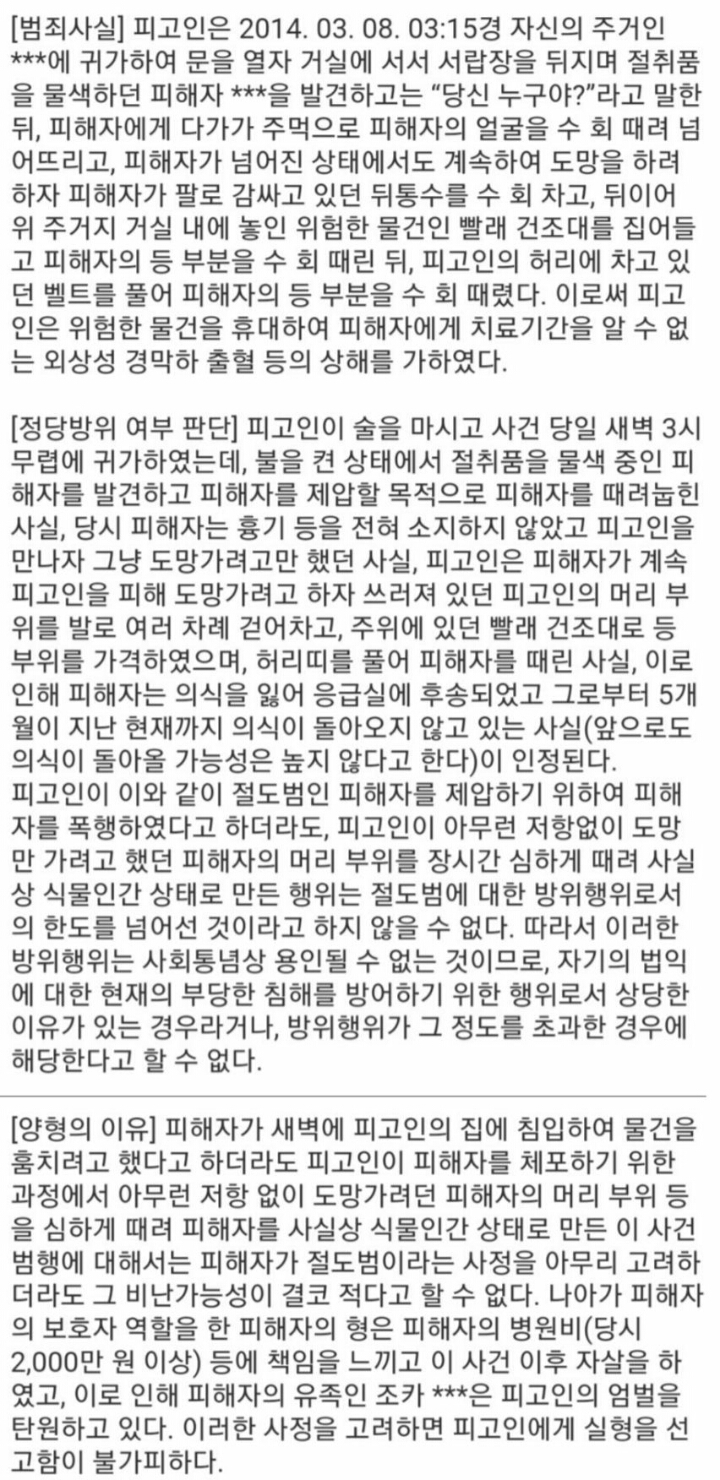 근데 이 집주인은 도둑을 발견하고 때려서 쓰러트렸는데 여기서 도둑은 도망가려했으나 집 주인이 20분안 빨래거치대와 주먹으로 머리만 집중 구타함.