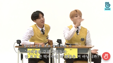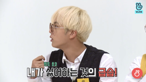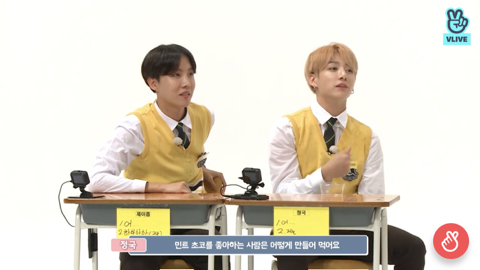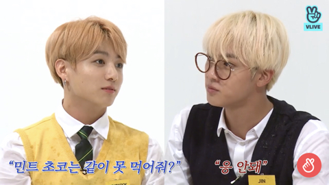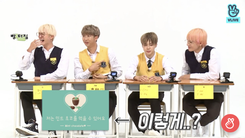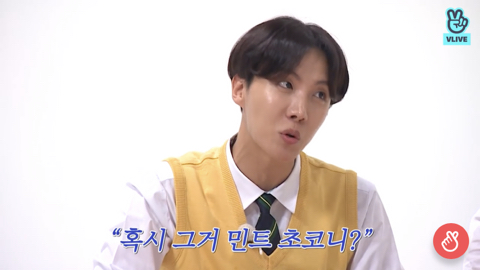 제이홉 : 민트초코를 자꾸 치약맛이 난다고 하는데 치약을 누가 먹습니까? 민트초코는 민트향이 난다는 것이고 치약과는 비교자체가 안됩니다. 치약을 누가먹나요? 치약은 저도 안 먹습니다! (화남)
