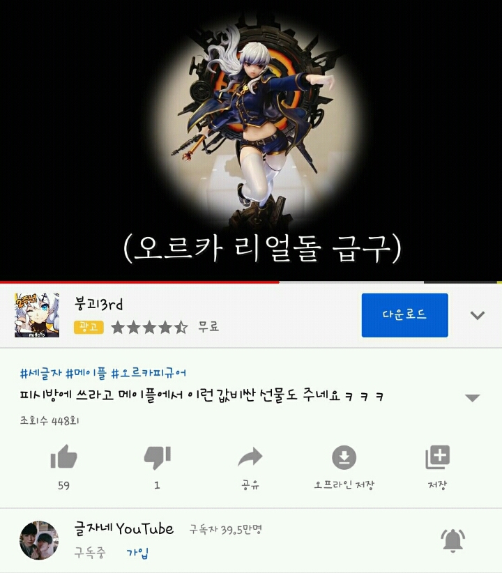오르카 피규어보고 오르카 리얼돌 급구라고 자막뜸 후에 사과하고 영상을 재편집했으나 다른피규어 신체부위를 부각하는 장면으로 편집함(스샷참고)