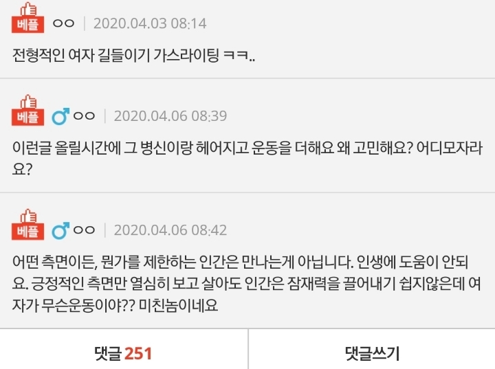 무엇보다 이해 못 하겠는 건 사귀기 전부터 알고 지내서 (여동생 지인)저 운동 좋아하고 꼬박꼬박 하는거 알면서도 사귄 거잖아요. 그렇게 싫었으면 운동 안하는 더 "여성적인" 분을 찾았어야죠...