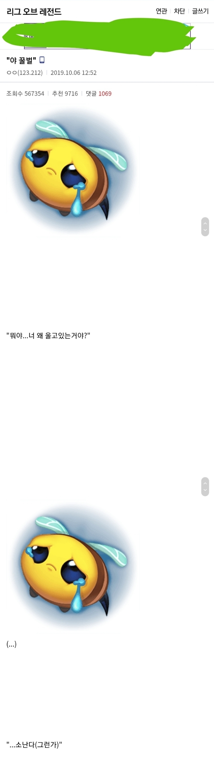 작성자Li2ly 작성시간 20.05.07 하 진짜 우리 티모닮은 꿀벌한테 개지랄들이야 존나빡쳐 시발