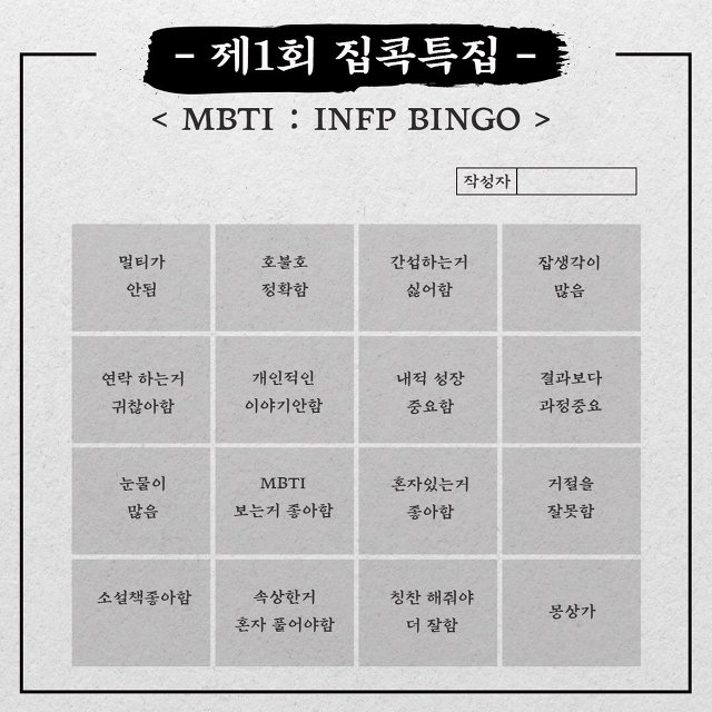 ㅋㅋ 찐 INFP 인듯 ㅎ 몇번을 검사해봤는데 계속 INFP 나왔대
