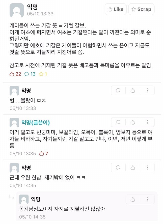 [기타]기갈의 뜻 작성자재기재기옵서|작성시간20.05.26|조회수17,192 목록 댓글 25 글자크기 작게가 글자크기 크게가 기갈 뜻 궁금해져서 검색하다 발견한건데 이것도 여혐단어였음... 다음검색 현재 게시글 추가 기능 열기 북마크 공유하기 신고 센터로 신고 댓글 댓글 25 댓글쓰기 답글쓰기 댓글 리스트 작성자송초코(이미 밥 먹음) | 작성시간 20.05.26 저게 언제 순환됨? 똥꼬츙한테만 쓰는말 아니냐구ㅠ 작성자피자피자피자먹고싶어 | 작성시간 20.05.26 ㅅㅂ 작성자손톱만큼 좋아해 | 작성시간 20.05.26 기쎈 갈똥꼬 작성자너 진짜 과카몰리네 | 작성시간 20.05.26 응 기쎈 갈조ㅈ 작성자야구과몰입하지말자 | 작성시간 20.05.26 갈ㅈ~~ 댓글 전체보기