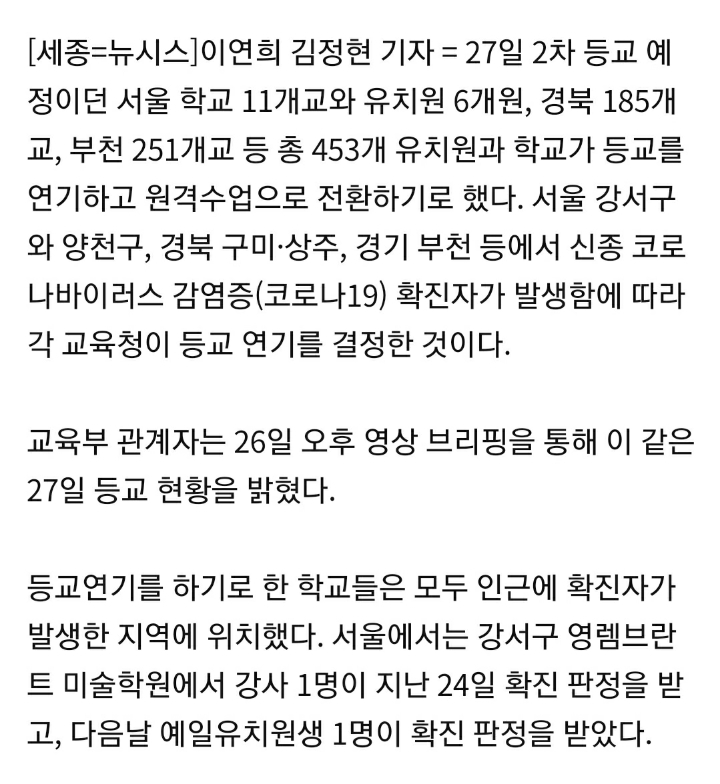 [기사]부천 모든 학교·유치원 등교 연기…서울·경기·경북 총 453개교 미뤄(종합2보) 작성자뚱땅이야통이|작성시간20.05.26|조회수2,226 목록 댓글 12 글자크기 작게가 글자크기 크게가 출처 부천 모든 학교·유치원 등교 연기…서울·경기·경북 총 453개교 미뤄(종합2보)[세종=뉴시스]이연희 김정현 기자 = 27일 2차 등교 예정이던 서울 학교 11개교와 유치원 6개원, 경북 185개교, 부천 251개교 등 총 453개 유치원과 학교가 등교를 연기하고 원격수업으로 전환하기로 ��news.naver.com 등교 낼 부터 시작인데 선생님들 온라인 수업 해야하실 듯ㅠㅠㅠ 다음검색 현재 게시글 추가 기능 열기 북마크 공유하기 신고 센터로 신고 댓글 댓글 12 댓글쓰기 답글쓰기 댓글 리스트 작성자연분홍 장미 | 작성시간 20.05.26 이럴거면 개학을 더 미루지 차라리... 작성자extra-ordinary you | 작성시간 20.05.26 하.... 작성자사과문내놔 | 작성시간 20.05.26 하루종일 학교 뛰어다녔는데 퇴근 시간 지나고 개학 연기됨🤦🏻♀️ 작성자유모씨차에치었으면좋겠다 | 작성시간 20.05.26 좆팔롬아 진짜 작성자치즈방구 | 작성시간 20.05.27 교육부 진짜 무능력..선생님들이랑 학생들만 불쌍함 ㅠㅠㅠㅠ 댓글 전체보기