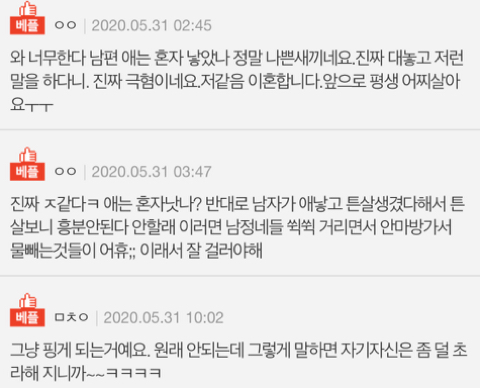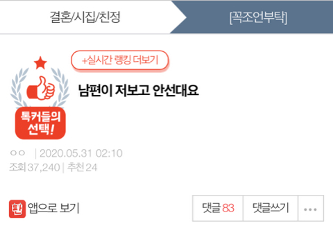 [판&톡]남편이 저보고 안선대요 작성자수영처돌이|작성시간20.05.31|조회수13,007 목록 댓글 38 글자크기 작게가 글자크기 크게가 https://m.pann.nate.com/talk/351967033?order=B 다음검색 현재 게시글 추가 기능 열기 북마크 공유하기 신고 센터로 신고 댓글 댓글 38 댓글쓰기 답글쓰기 댓글 리스트 작성자오나나나오나나나오 | 작성시간 20.05.31 응 발기부전 작성자대담 | 작성시간 20.05.31 이혼하세요. 작성자싶었어 | 작성시간 20.05.31 으 작성자1일1한남조지기 | 작성시간 20.05.31 그럼 진짜 못 서게 잘라버릴래 작성자Tom Welling | 작성시간 20.06.01 성불구내 댓글 전체보기