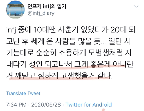 작성자Mascarpone 작성시간 20.06.09 어 완전 나잖아..?? 나 그래서 20살 때 저런 생각 진짜 많이 했음 분명히 어렸을 땐 주변 어른들 말 잘 듣고 살았고 순종적으로 살아서 칭찬도 많이 받고 그냥 올바르게 살고 있다고 생각했는데 갑자기 성인 되니까 고지식하고 답답한 사람 취급 받음... 사람들은 통통 튀고 자유롭고 말 많이 하는 20대를 더 좋아하더라...