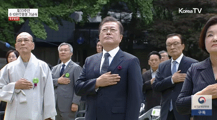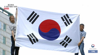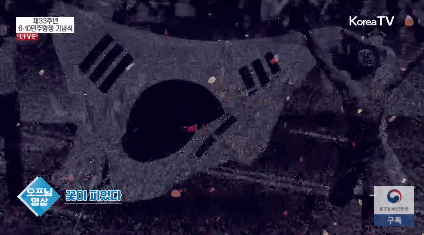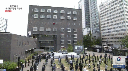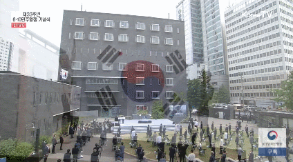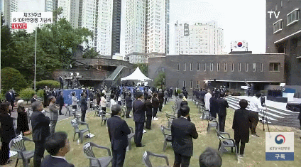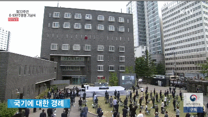 사회자2 : 먼저 국민 의례가 있겠습니다. 모두 자리에서 일어나 주시기 바랍니다. 왼편 건물 위 태극기를 향해 주시기 바랍니다.