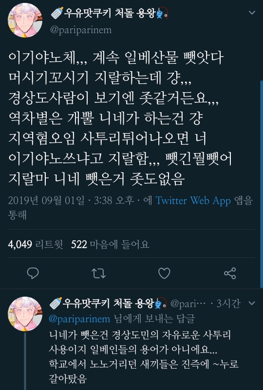 전보다 쓰는 일베가 줄었든 아니든 뺏어왔답시고 많이 쓰면서 수면위로 올라오게 된 것같은데 그 후 부턴 그냥 일반사람들도 쎈척 쓰고 싸울때 쓰고 누구 조롱할때쓰고..등등.. 더 쓰게된것 같아 그냥 사투리를 쓰는건데도 눈치보는 지방에서 온 지인들도 많이봐서..기분 나쁜게 공감됐음..ㅠㅠ