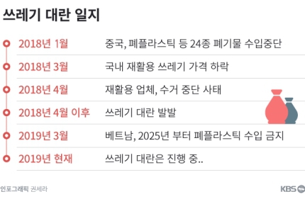 지난해 4월에는 재활용품 수거업체들이 폐비닐, 폐스티로폼 등의 수거를 거부해 아파트 단지 곳곳에 쓰레기가 쌓이는 ‘쓰레기 대란’을 겪었다. 올해 2월에는 플라스틱으로 위장해 필리핀으로 불법 수출했던 한국산 쓰레기가 다시 반송돼 돌아오는 낯 뜨거운 일이 벌어졌다.