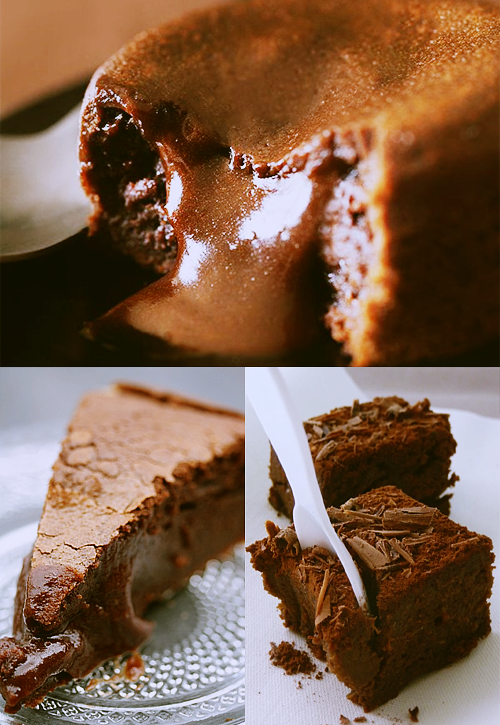 완성된 케이크를 포크로 가르면 안쪽에 있던 초콜릿이 흘러내림