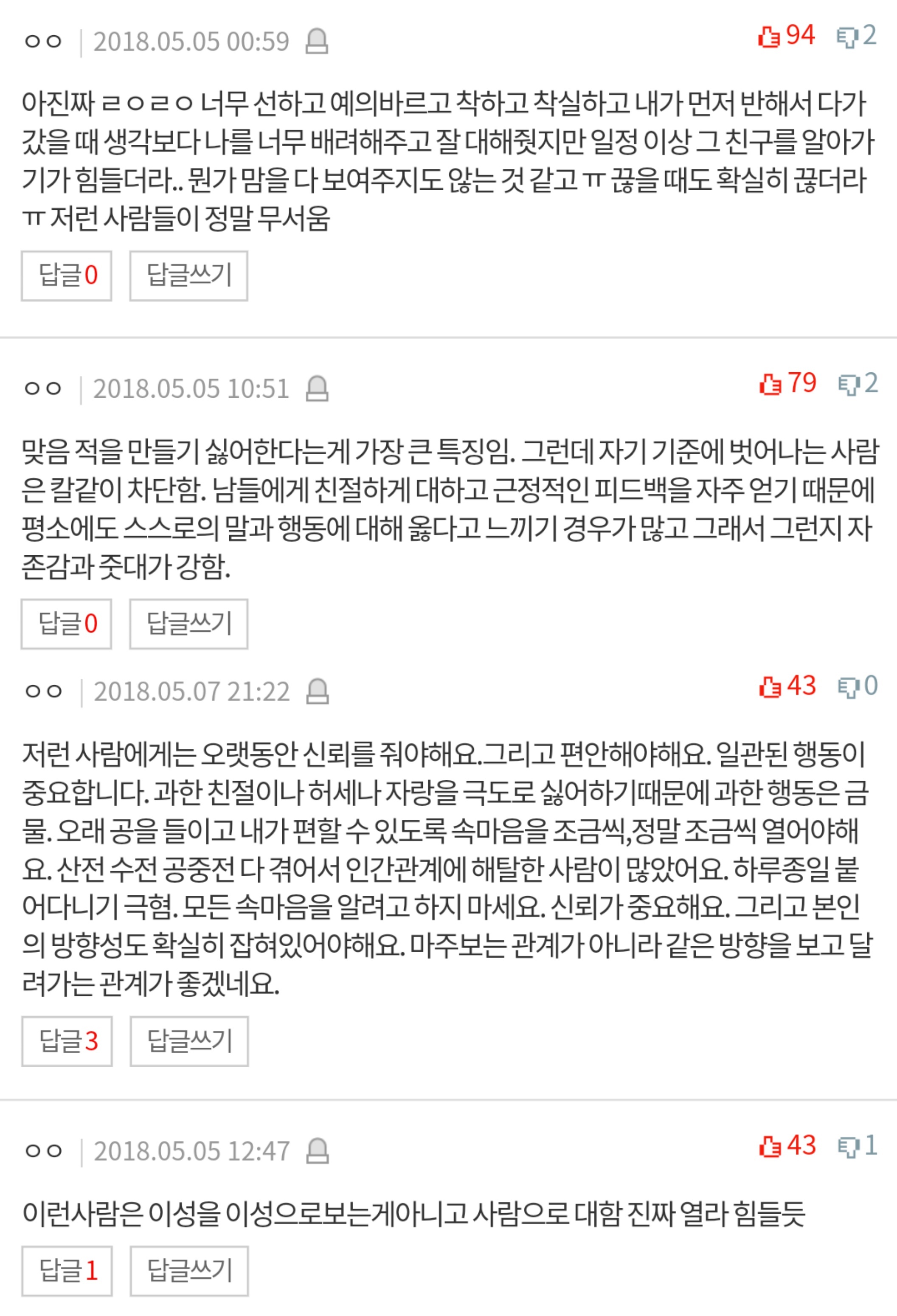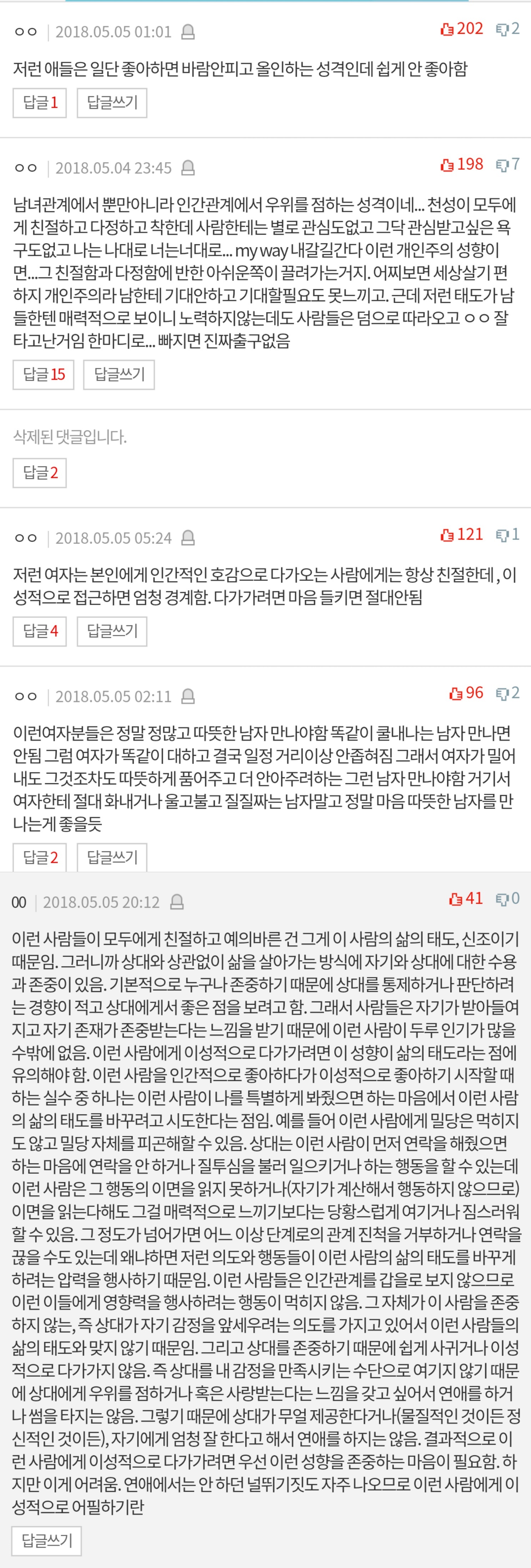작성자난니가내께될거라고확신해 작성시간 20.07.07 ㅈㄴ 내전남친이랑 전썸남 성격이네 ㅅㅂ 난 이런 사람들한테 끌리는걸까.,