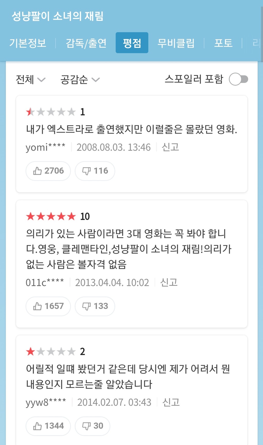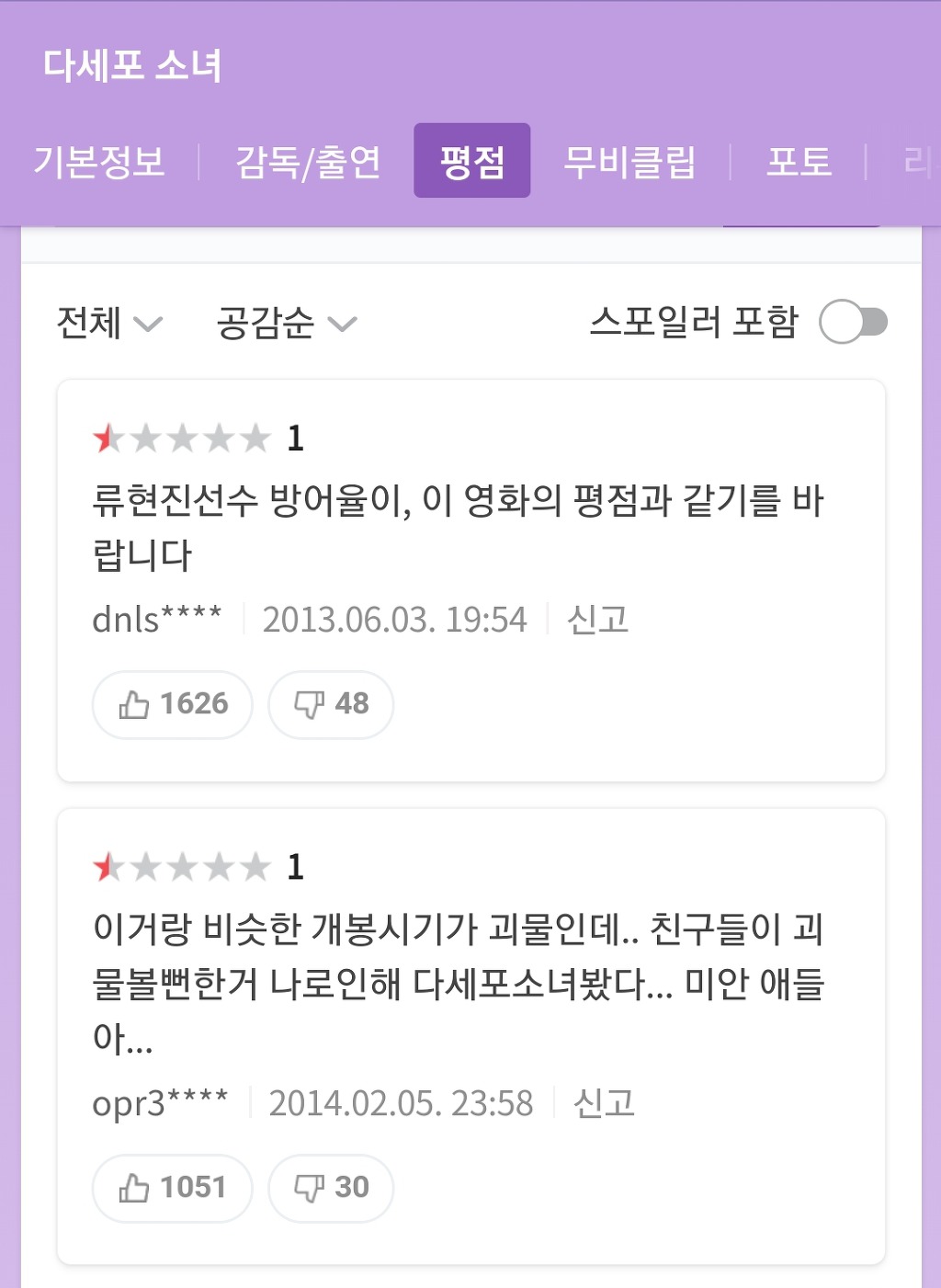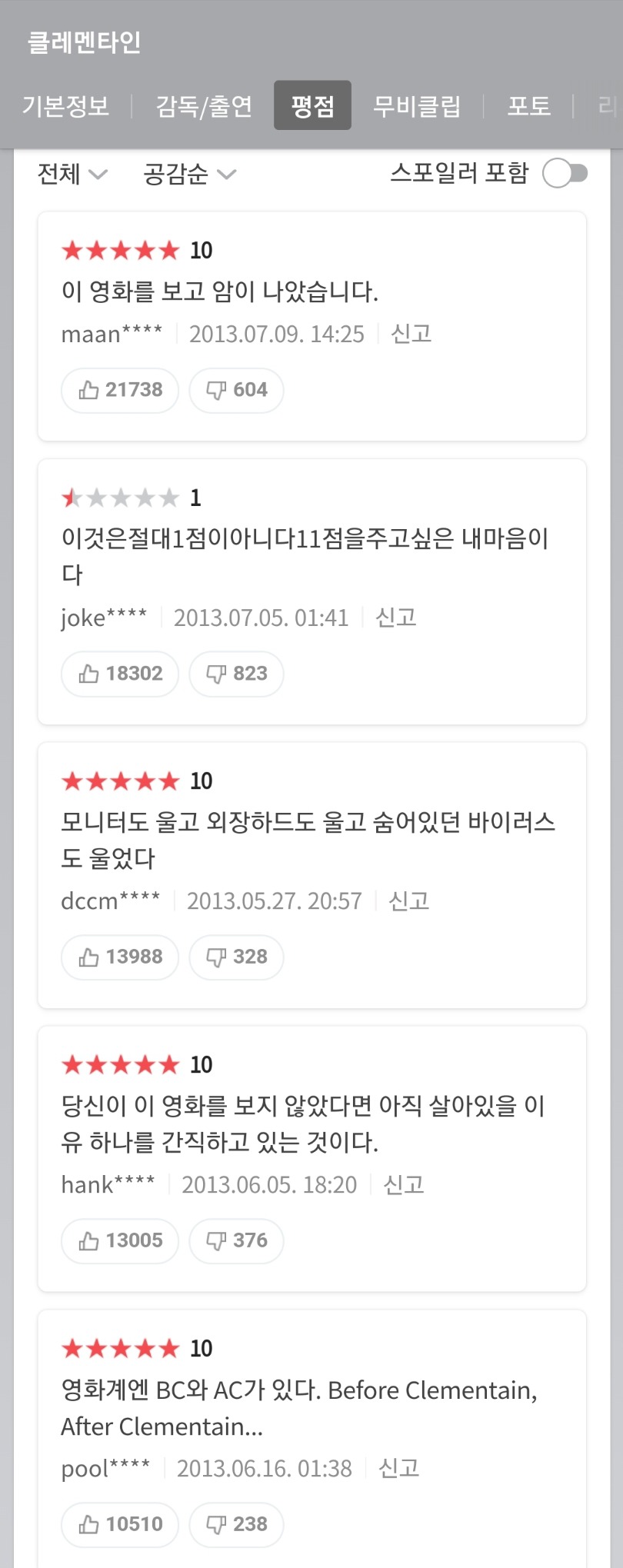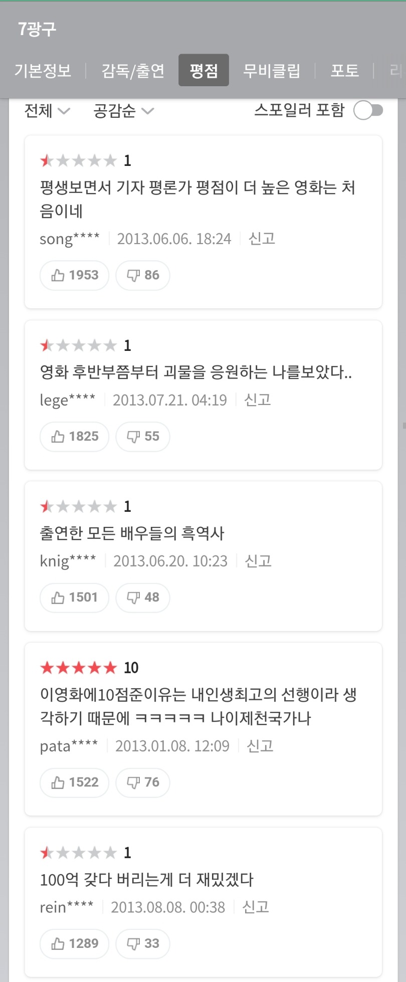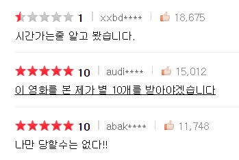 [유머]개웃긴 영화 평점 모음.jpg 작성자마이시톨|작성시간20.07.19|조회수7,669 목록 댓글 7 글자크기 작게가 글자크기 크게가 <리얼>출처 : 네이버 영화문제시 영화 다 보고 막생에 후기씀 다음검색 현재 게시글 추가 기능 열기 북마크 공유하기 신고 센터로 신고 댓글 댓글 7 댓글쓰기 답글쓰기 댓글 리스트 작성자크레페 땡겨요 | 작성시간 20.07.19 아 근데 리얼은 생각보다 괜찮았음 너무 평이 구렸어서 그런가 작성자dreamingforest | 작성시간 20.07.19 ㅋㅋㅋㅋㅋㅋㅋㅋㅋㅋㅋㅋㅋ아 ㅋㅋㅋㅋㅋㅋㅋ 삭제된 댓글입니다. 답댓글 작성자김수현 배우자 | 작성시간 20.07.19 리얼 배드신 빼면 볼만해 작성자이 빌라의 탑층의 복합구조입니다 | 작성시간 20.07.19 아 진짜한국사람들존나웃김 댓글 전체보기