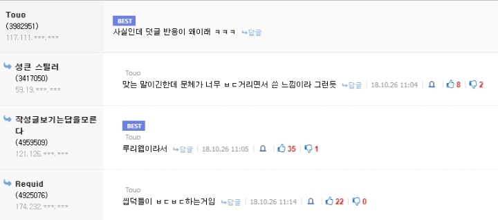 이런 되도 않은 인신공격성글 올리는 새끼들 현실에서 보면 뚝배기를 깨니마니 하는둥