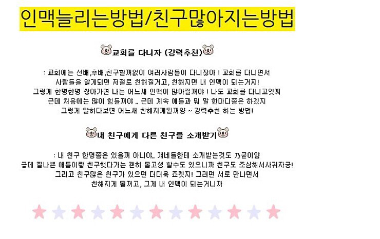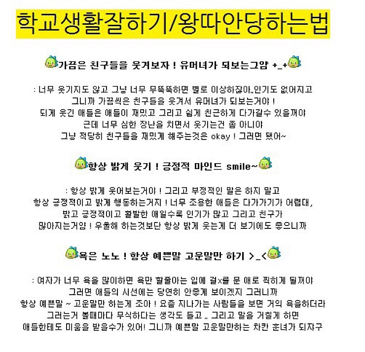 [기타][훈녀생정] 학교생활잘하기/잘나가는법/인맥늘리는방법/친구많아지는방법 작성자해외여행 가고싶다|작성시간20.09.08|조회수5,976 목록 댓글 14 글자크기 작게가 글자크기 크게가 ㅊㅊ는 사진속 링크 가져오고 싶었지만 블로그를 폭파시키셨어훈녀생정 읽었던 분들 모두 지메됐 ㅅㅊㅅㅊ🙏🏻 다음검색 현재 게시글 추가 기능 열기 북마크 공유하기 신고 센터로 신고 댓글 댓글 14 댓글쓰기 답글쓰기 댓글 리스트 작성자거꾸로 해도 오레오 | 작성시간 20.09.08 교회 다니기 이거 ㄹㅇ인듯 인맥 조따 넓어 작성자휴학하고싶다악 | 작성시간 20.09.08 교회 찐이다 ㅋㅋㅋㅋㅋㅋㅋㅋㅋ 서로 다른초 나왔는데 아는사이여서 알고보면 다 교회인맥임ㅋㅋㅋㅋ 삭제된 댓글입니다. 답댓글 작성자036153 | 작성시간 20.09.08 2010-2013정도 작성자내사랑 천러 | 작성시간 20.09.08 ㅋㅋㅋㅋㅋㅋㅋㅋㅋ아 ㅅㅂㅋㅋㅋㅋ 추억팔이 조지네 그땐 그랬지ㅋㅋ 댓글 전체보기
