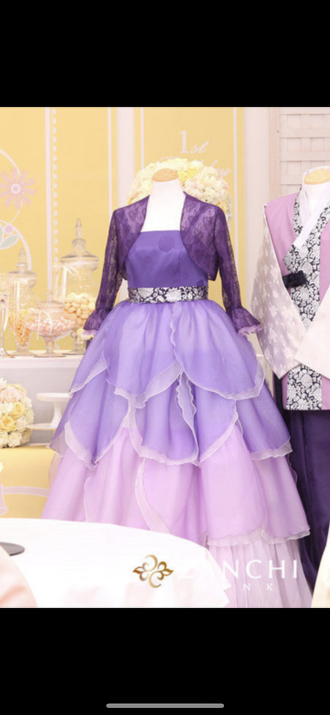 저 사진이랑 똑같은 건 아니고 최대한 비슷한걸로 서치해서 찾았는데요 계열은 퓨전이 맞고 저고리가 볼레로 인데 저것 보단 연한색이에요 밑에 치마는 보라색 그라데이션 이구요