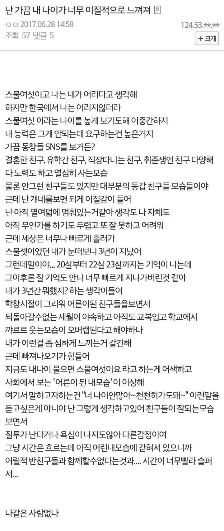 작성자frodoe 작성시간 20.10.13 나 진짜 철 안듦.. 나만 빼고 다 어른같아 나 존나 어린애같아 ㅠ