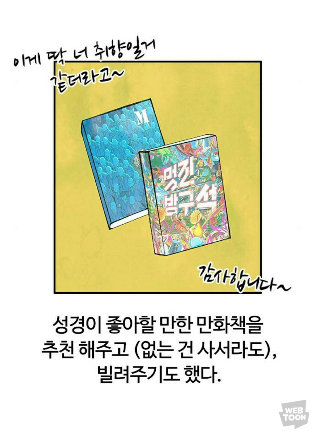 지난주까지의 무료분(4화)이 위 내용이고 5화부터 성경의 대학생활이 본격적으로 시작될거같아!