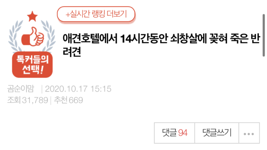 안녕하세요. 저는 최근 뉴스에 나온 애견호텔사장 학대로 죽은 곰순이 엄마입니다. 결혼시집친정 카테고리에 글을 올리는 이유는 저도 결혼을 한 유부녀이고 아직 아기는 없지만 반려동물을 자식처럼 아끼고 살았기 때문입니다. 혹시라도 불편함을 느끼시는 분들 계시다면 먼저 죄송하다는 말씀 드립니다.