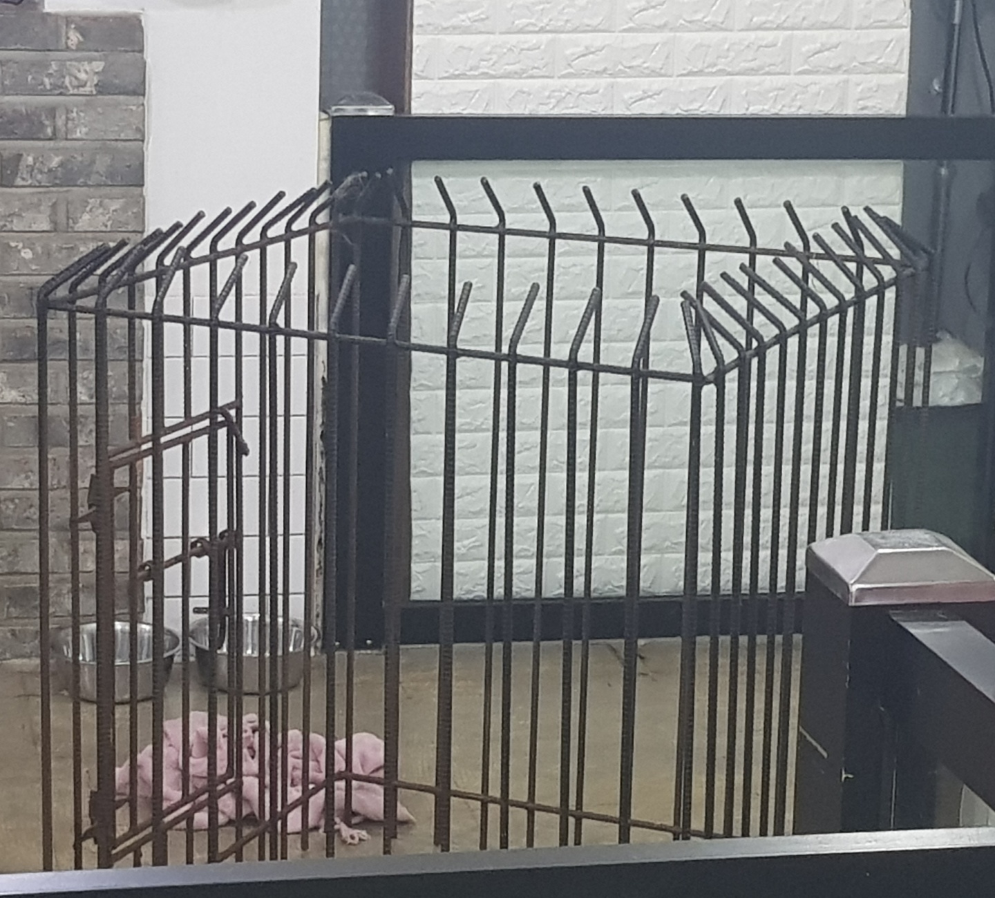 19시 20분 또 다시 사장은 똑같은 무쇠창살에 곰순이를 가두고 창살위 얹었었던, 곰순이가 케이블 타이를 끊어놓아 너덜해진 판을 보수하여(케이블 타이를 묶어) 창살 위에 얹어 반려견을 가두고, 19시 30분 경 또 다시 업무시간을 지키지 않고, 저에게 얘기조차 하지 않은채 퇴근해버립니다.