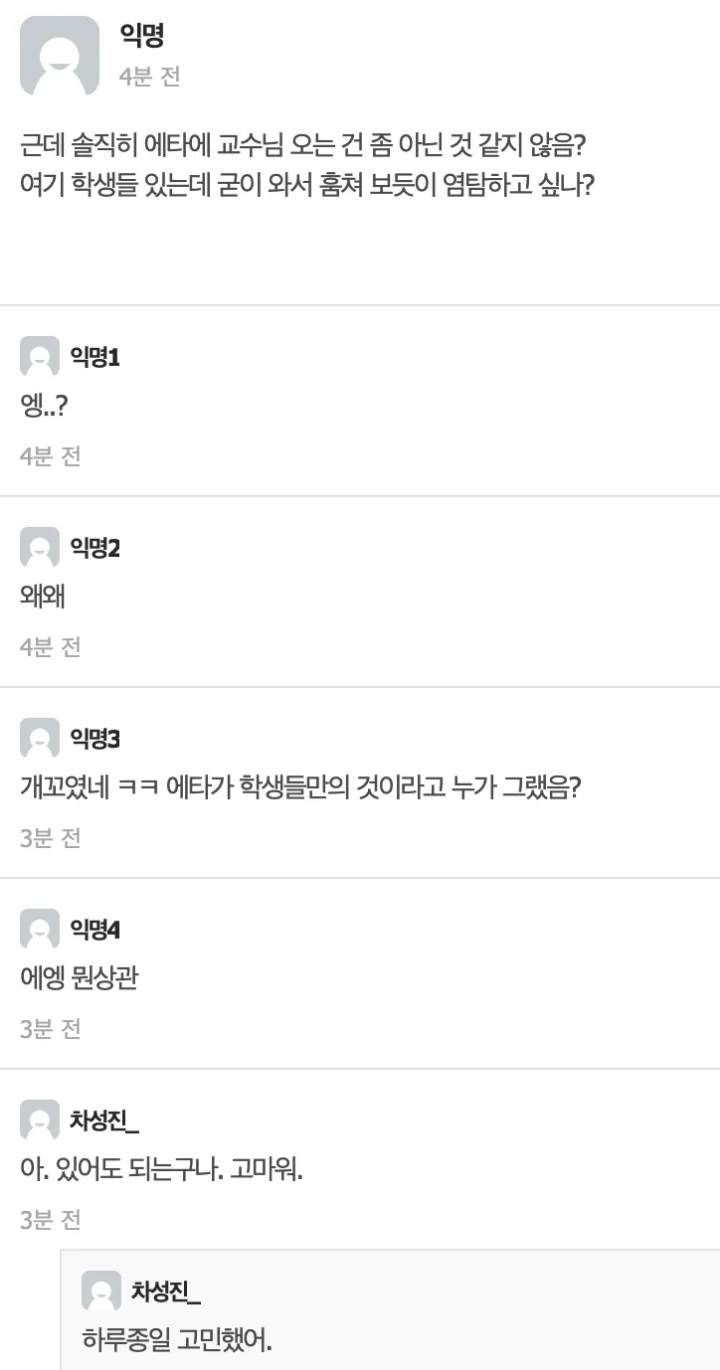 작성자감히 내게 명령을 해 작성시간 20.10.20 07인데 교수님이라고..? 내가 듣는 강의에 아직 09학번분 계신데..