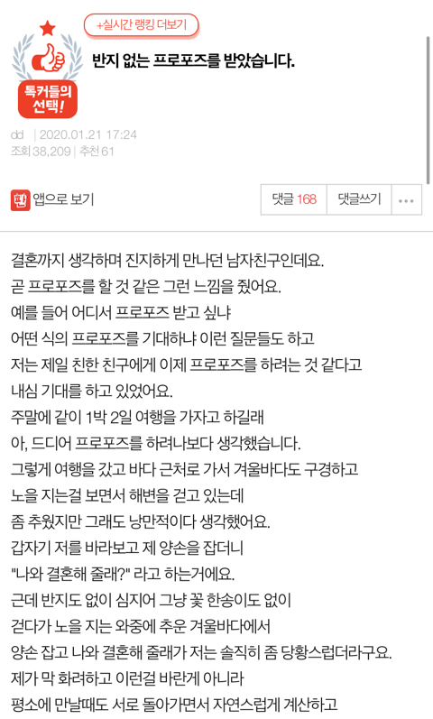 돌아오는 대답이 "자기는 비싼거 바라지 않는 줄 알았지. 반지 기대했어?"