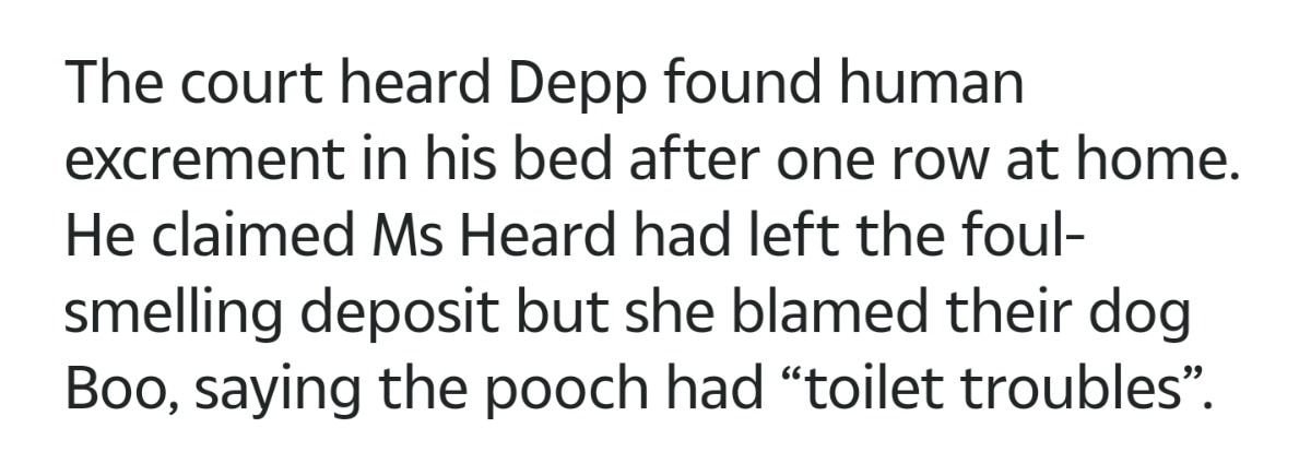이걸로 엠버 허드 미친년이다 더럽다 등등 욕 엄청 먹었는데 알고보니 거짓이었고 저건 반려견이 쌌던 것... 엠버 허드가 쌌다는 주장은 재판에서 기각당함