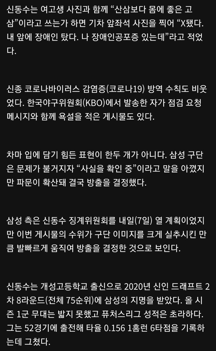 작성자참숯집 작성시간 20.12.06 성적뿐만 아니라 인성도 초라한 신뭐시기... 뭐하나 내세울게 없는 인성 구린 놈이 여태까지 구단에 있었다니 참 놀랍다.