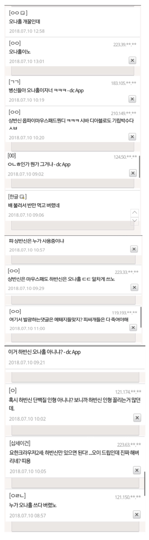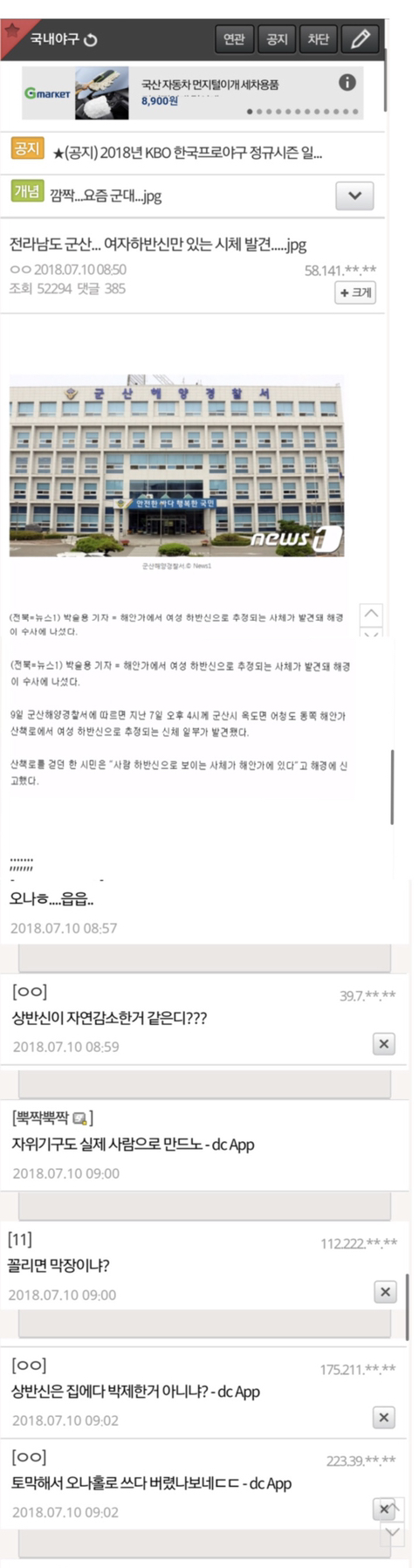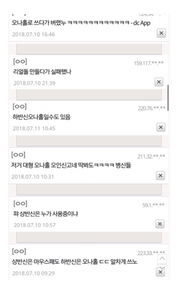 오나홀이라는 기사도 아니고 사람의 하체로 추정되는 사체가 발견 되었다는 뉴스네 자위 도구인 오나홀이라고 칭하며 비웃는게 현실 만약 저게 실제 사체라면? 쟤들이 갑자기 안타까워 하고 있을까? 심지어 발견 되지 않은 상반신 마저도 집에서 마우스 패드(여자 캐릭터 가슴 마우스 패드)로 사용 하는거 아니냐면서 조롱