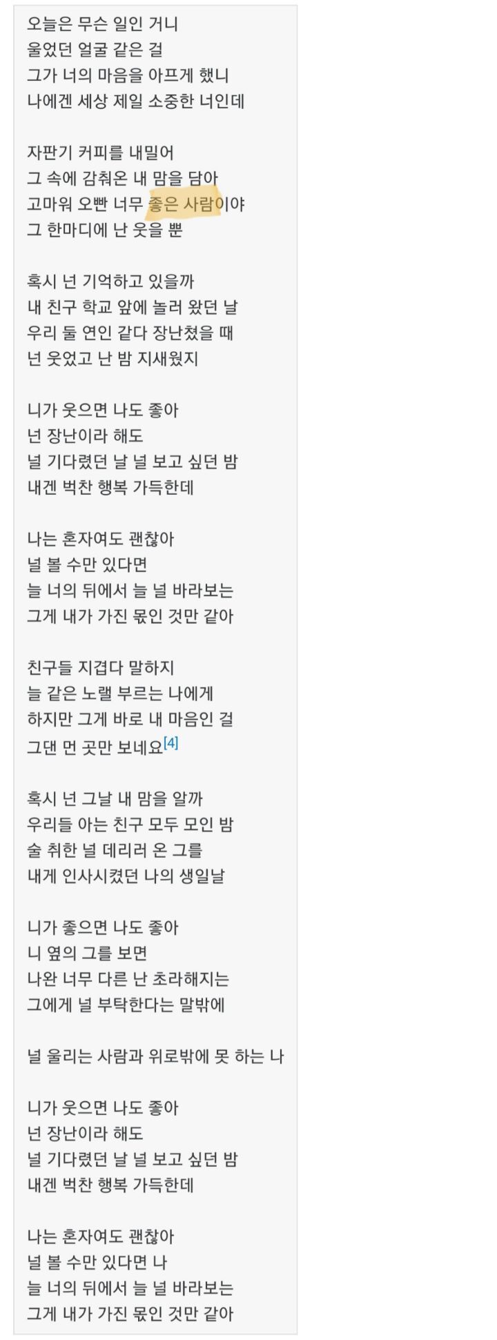 내가 칠해놓은 부분을 보면 화자가 짝사랑하는 여자가 화자를 '좋은 사람'으로 칭하는 걸로 볼 수 있어.