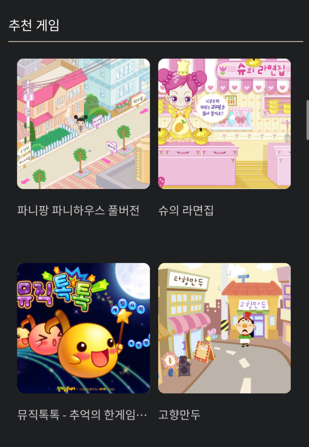슈 시리즈, 고향만두, 파니팡, 감자도리, 동물농장게임 등등 ㄹㅇ 다 있음