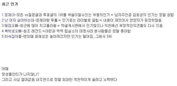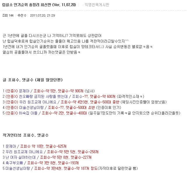 1년전에 내가 인기순위 글올렸을때 이후로 럽실이 망테크타서(;;) 사실 순위변동은 별로없ㅋ음ㅋ