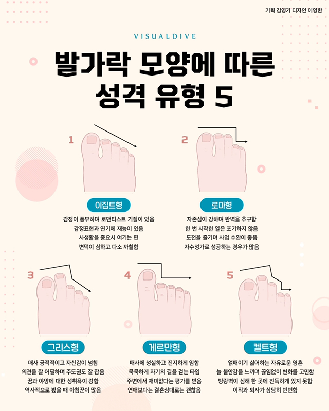 [기타]발가락 모양에 따른 성격 유형 작성자노랑후드|작성시간21.01.10|조회수14,999 목록 댓글 30 글자크기 작게가 글자크기 크게가 나는 맞는거같애 게녀들은 ?ˀ?ˀ 다음검색 현재 게시글 추가 기능 열기 북마크 공유하기 신고 센터로 신고 댓글 댓글 30 댓글쓰기 답글쓰기 댓글 리스트 작성자FIRST TIME | 작성시간 21.01.11 1번 맞네!!! 작성자제발 합격하자 | 작성시간 21.01.11 1 작성자고로롱고로롱 | 작성시간 21.01.11 난 두번째발가락까지만 동일하고 나머지는 쭈루룩내려가는데 2번이랑 비슷하려나... 2번은세번째발가락까지라서ㅠ 작성자유ㅌH오 | 작성시간 21.01.11 나 그리스 작성자화호 | 작성시간 21.01.11 오 그리스형 댓글 전체보기