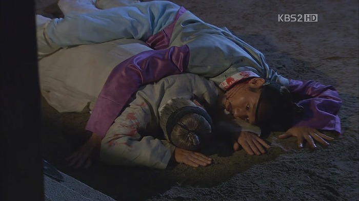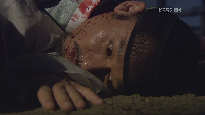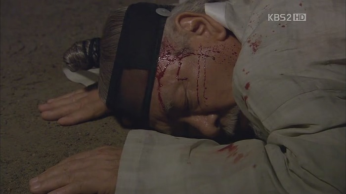 아버지를 감싸 안은 채 장지문 밖으로 쓰러지는 김승규