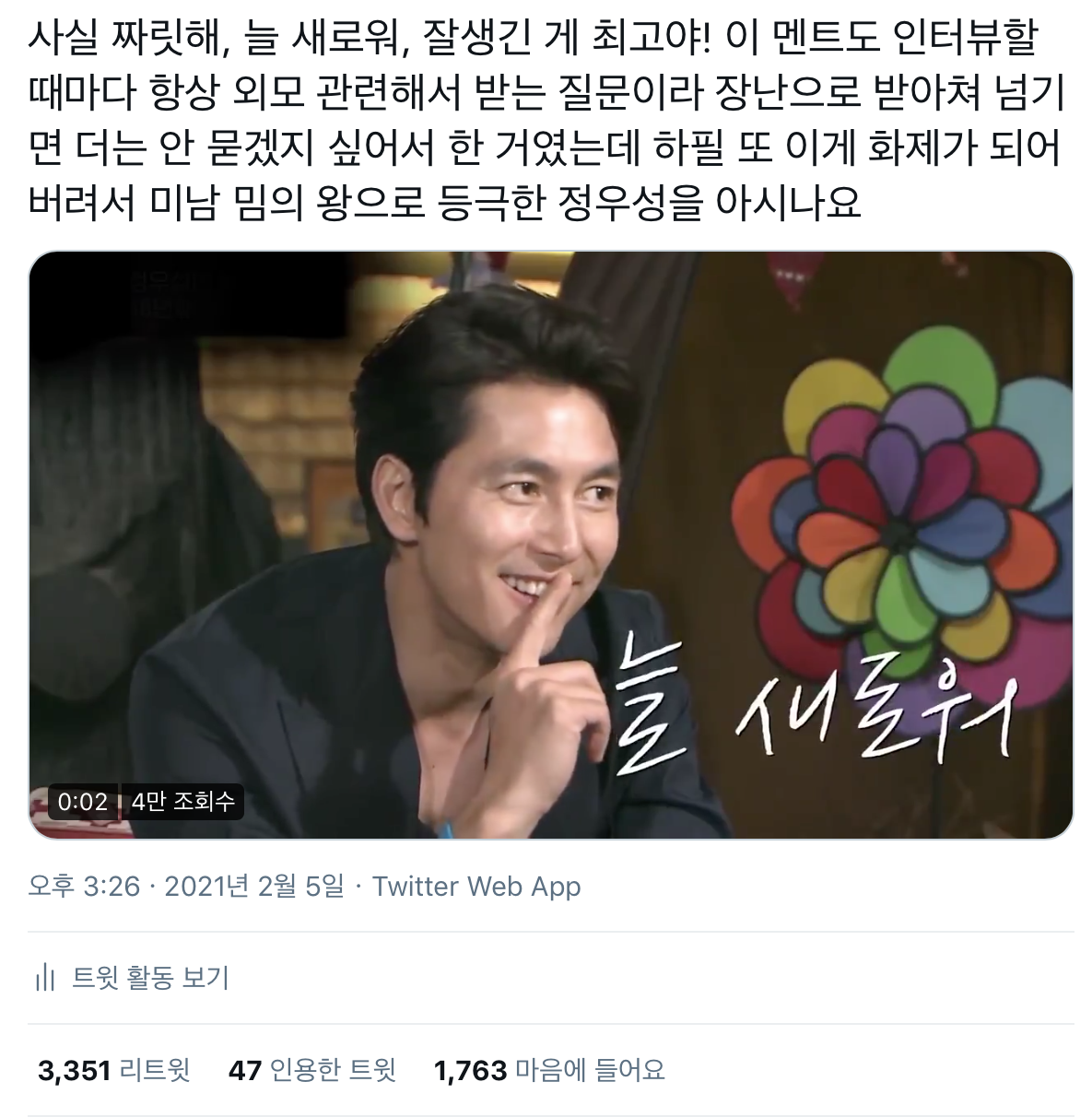 오히려 그 이후로 이 말이 유행하고 잘생긴 밈(?)이 만들어져서 아예 내려놓고 외모 관련해서는 유쾌하게 저렇게 넘기기 시작했다고 함