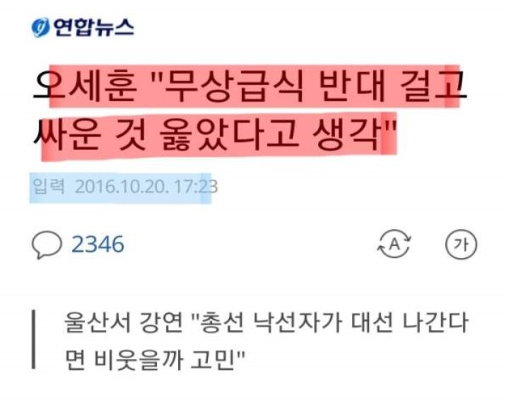 당시 무상급식 반대했던거 옳았다고 생각한다며