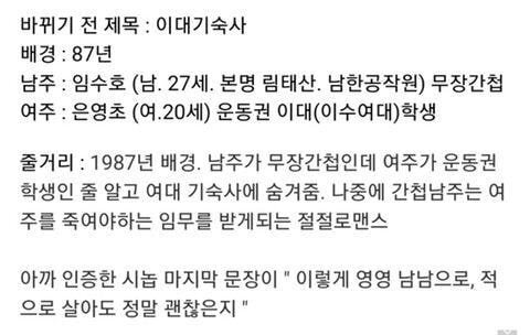 작성자그만큼과제가많으시다는거지 작성시간 21.03.26 간첩이 한국사람 죽여야되는 임무를 받는게 어딜봐서 절절로맨스인데요
