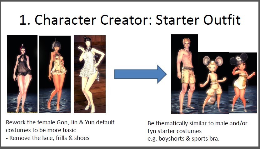 교태 어린 몸짓이 여성 캐릭터의 전유물인 것도 북미 담당자들에겐 ‘딴지’를 걸 만한 부분이었다. 블소의 캐릭터들은 모두 전투족인데, 왜 남성 캐릭터는 전투족에 어울리는 무뚝뚝하고 근엄한 태도를 지닌 것에 반해 여성 캐릭터들은 교태를 부리냐는 것이었다.