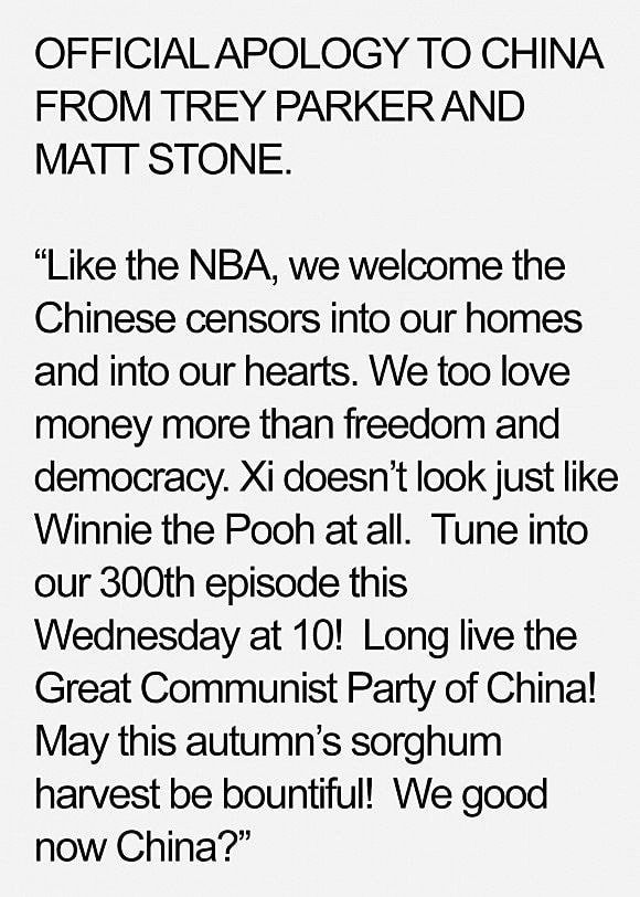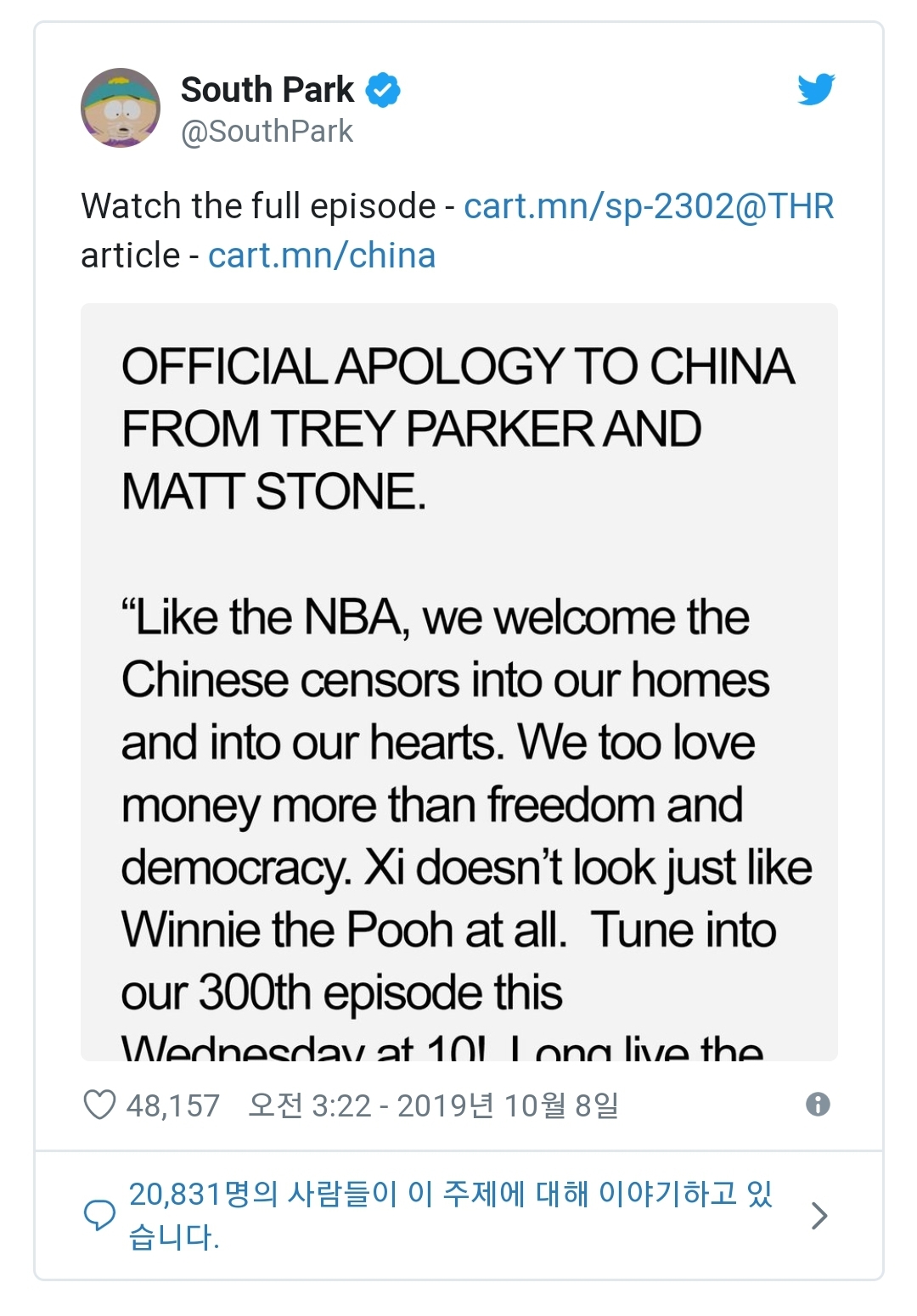 "NBA처럼, 우리도 우리의 집안과 마음 속에 중국의 검열이 들어오는 것을 환영합니다.