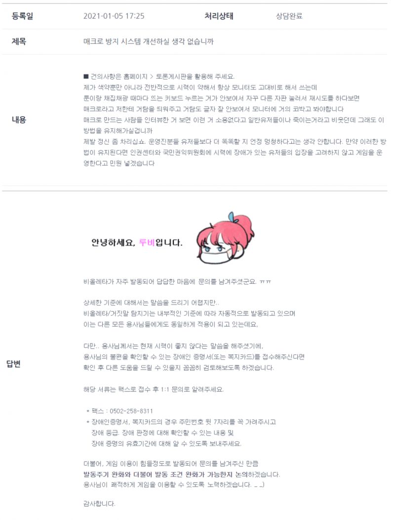 유저 "현재 매크로 방지 시스템은 색약(색맹) 유저가 구분하기에 매우 불편합니다. 개선해주세요"