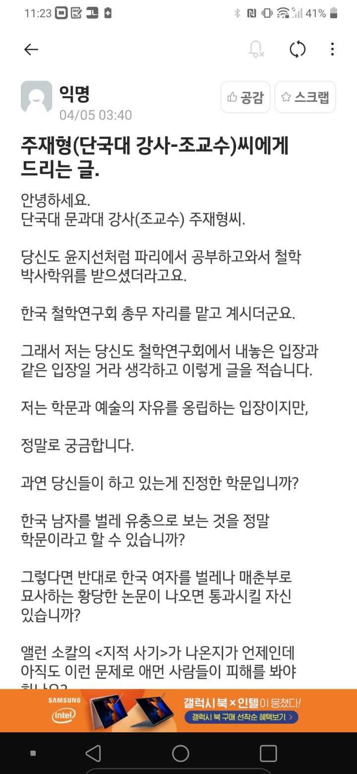 이게 니네들의 표현의 자유냐? 표현의 자유 운운하면서 주재형 교수님이 윤지선 교수랑 같은 소속이라는 이유로 에타에 이런 글 쓰는건 ㅋㅋㅋ 연좌제 아니야??