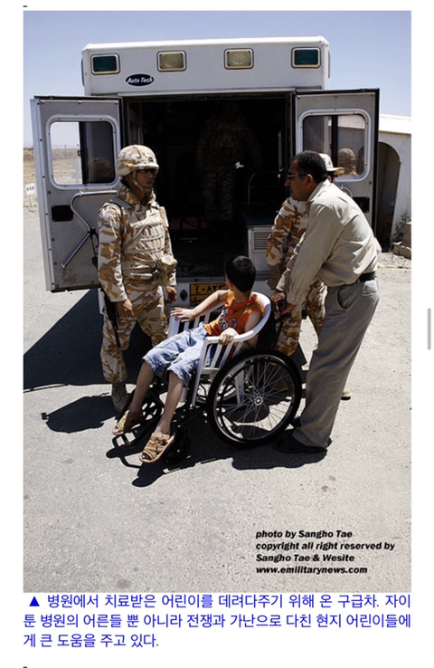현지주민을 위해 의료지원병 파견한 유일한 나라였음 이라크에서 치료안되면 한국 데려와서 치료해줌